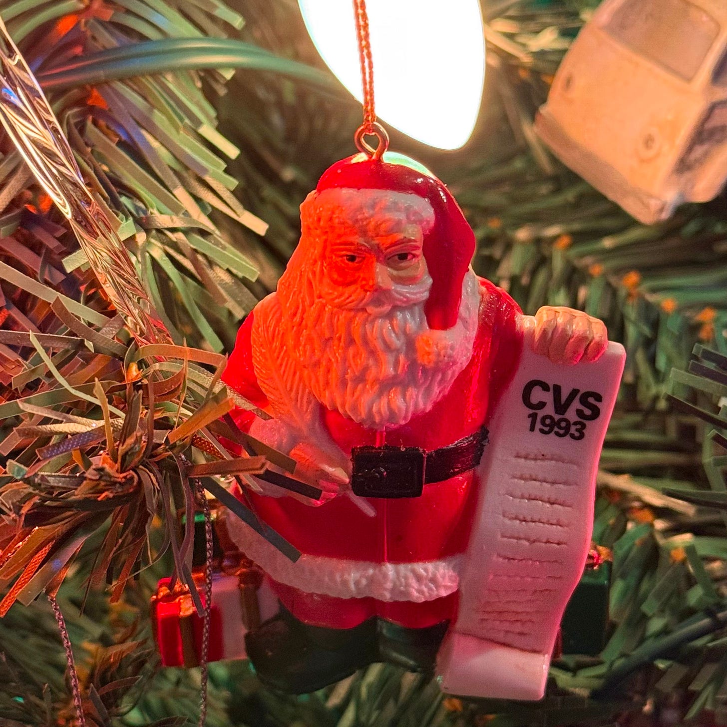 I bought a dinky, artificial tree from Target and decorated it with some of the ornaments I grew up with, including several wood-carved, hand-painted angels I had bought at my elementary school’s holiday boutique. But my all-time favorite was of Santa holding a mile-long CVS receipt from 1993.